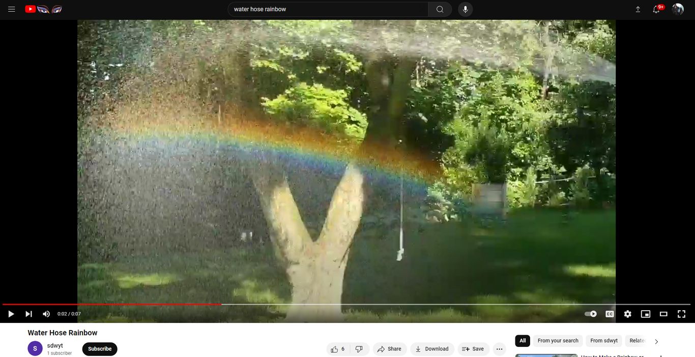 This rainbow is being viewed straight on and is produced using fast moving water drops from a garden hose, yet all colours are clearly visible.